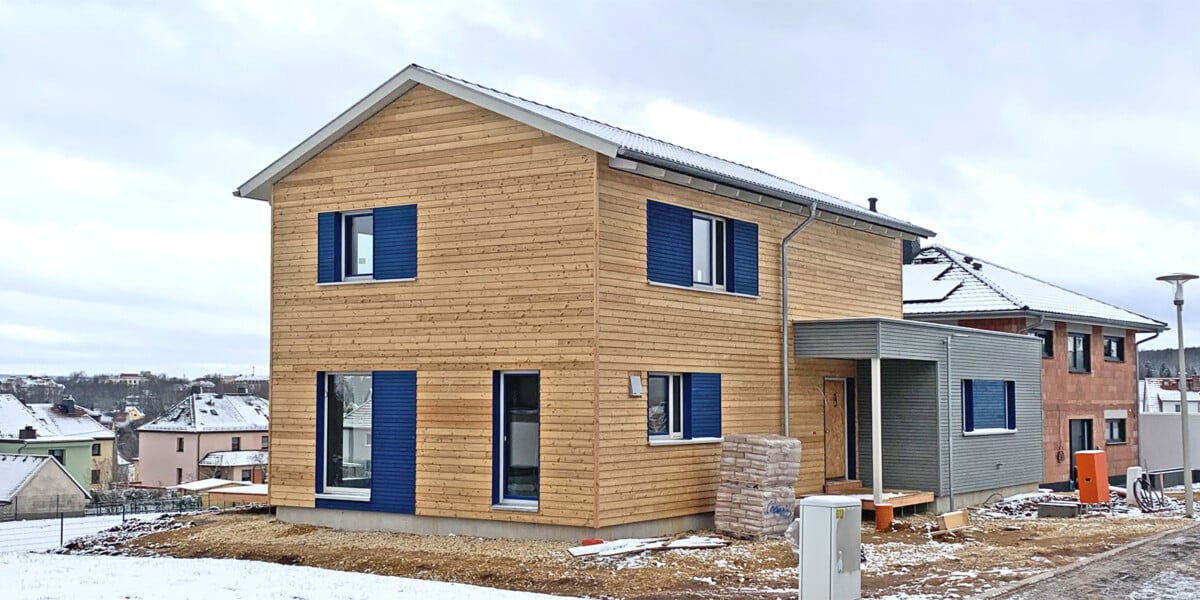Auf einem Grundstück am Hang, mit Ausblick in die Ferne entsteht dieses wohngesunde Thüringer Holzhaus. Neben einer ansprechenden Fassadengestaltung ist die innere Zonierung von besonderer Bedeutung, weshalb sich diese bereits in der Gebäudeform erkennen lässt. Der eingeschossige Anbau beinhaltet im Zentrum ein großes Zimmer mit erhöhten Schallanforderungen. Aufgrund geschickter Anordnung dienender Räume kann er jedoch auch als gesonderter Wohnbereich genutzt werden.